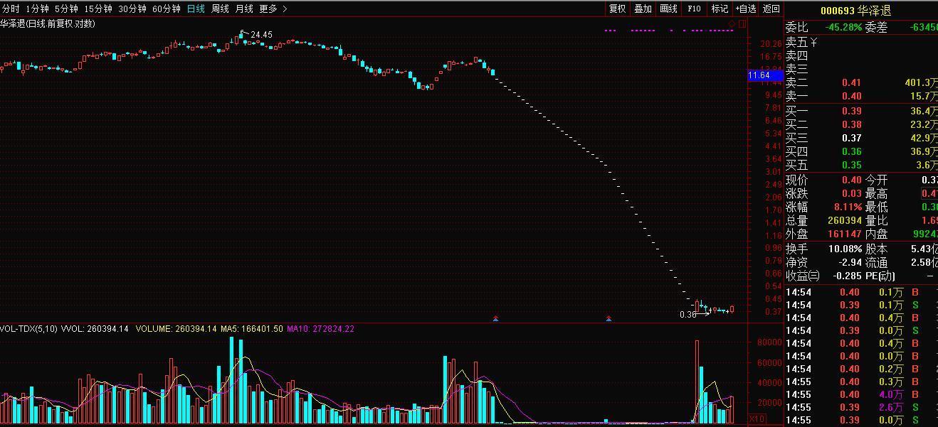 从图上可以看到,进入到退市整理期的股票,它们三个名字上都带了一个“退”字,相当于一个警示,在这种风险警示之下,股票基本上就是连续跌停的表现。其中华泽退,甚至还床走了个连续跌停天数的记录。