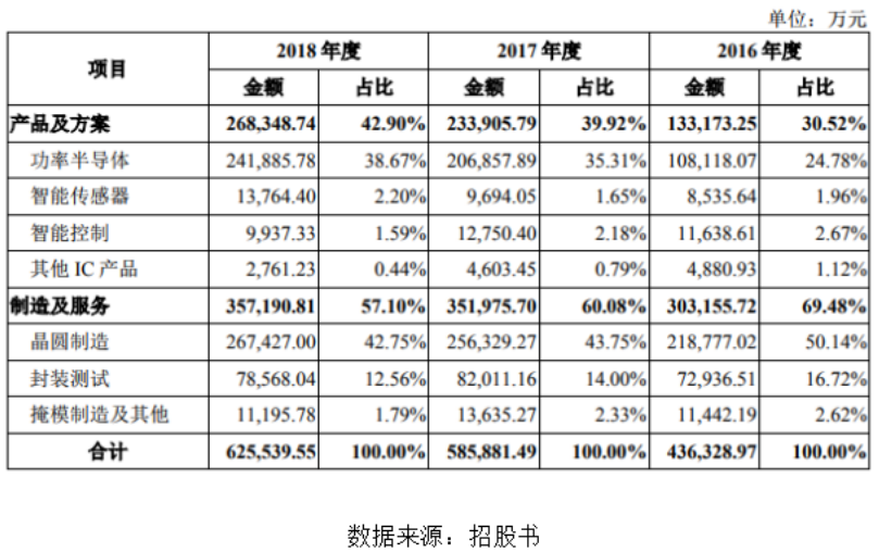 招股说明书显示,2016年-2018年,华润微电子的产品及方案业务产生的销售收入分别为133173.25万元、233905.79万元、268348.74万元,分别占当期主营业务收入的30.52%、39.92%、42.9%;制造及服务产生的销售收入分别为303155.72万元、351975.7万元、357190.81万元,分别占当期主营业务的69.48%、60.08%、57.1%。