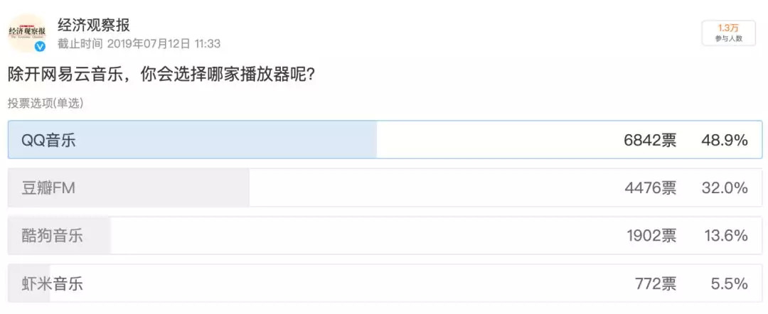 7月5日,经济观察报官方微博发布了一则投票。投票提问道,除开网易云音乐,你会选择哪家播放器?