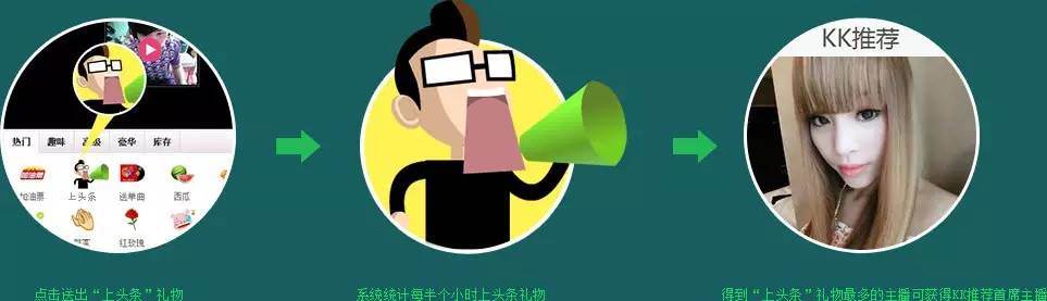汪峰在微博上头条难,在秀场,主播想要上头条也不简单。最高要花费万元人民币。像拉拉是“夜宴”从外站引进的主播,才艺很好,唱歌很好听,但一开始在KK没什么人认识,家族就支持她参加官方的活动,如家族擂主赛,周5、6、7有抢头条的活动,抢到头条就会置顶在官方的第一位,进直播间的玩家就会比较多,认识她的人也会比较多,现在她进来两个月,大多数人都知道拉拉唱歌比较好听。