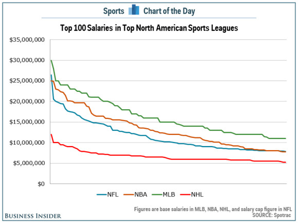 最近,Business Insider根据美国体育联盟收入数据平台Spotrac提供的数据,发布了北美各大职业体育联盟中顶级球员(收入前100的球员)的薪水状况。
