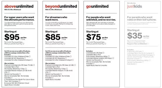 美国最大运营商Verizon公布的商用5G网络资费可以分为几档,基础资费85美元/月,流量不限,但速度被强制管控,比如只能看480p视频;进阶级别资费95美元/月,依然是不限流量,但速度上要比基础版快很多,可以观看720p视频。
