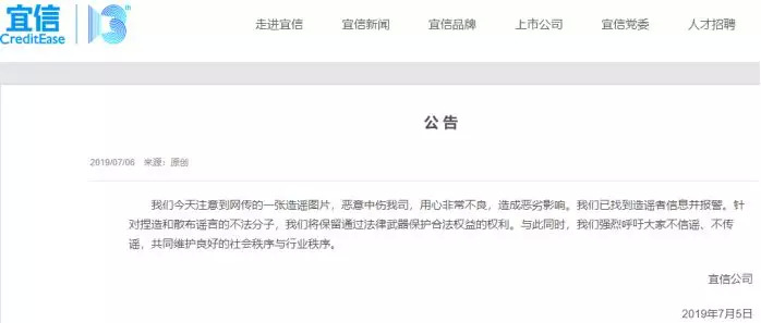 对宜信来说,入围首批征信修复名单绝对是一件喜事,但宜信还来不及高兴就被传出“破产”。为此,7月5日,宜信在官网发布公告称,“我们今天注意到网传的一张造谣图片,恶意中伤我司,用心非常不良,造成恶劣影响。我们已找到造谣者信息并报警。”