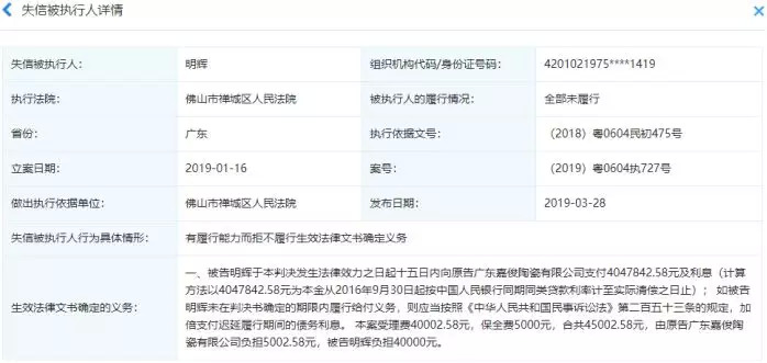 2019年3月,法院判决明辉15日之内向广东嘉俊陶瓷支付404.78万元及利息,因明辉被法院查出有履行能力而拒不履行生效法律文书,被佛山市禅城区人民法院列入失信被执行人。