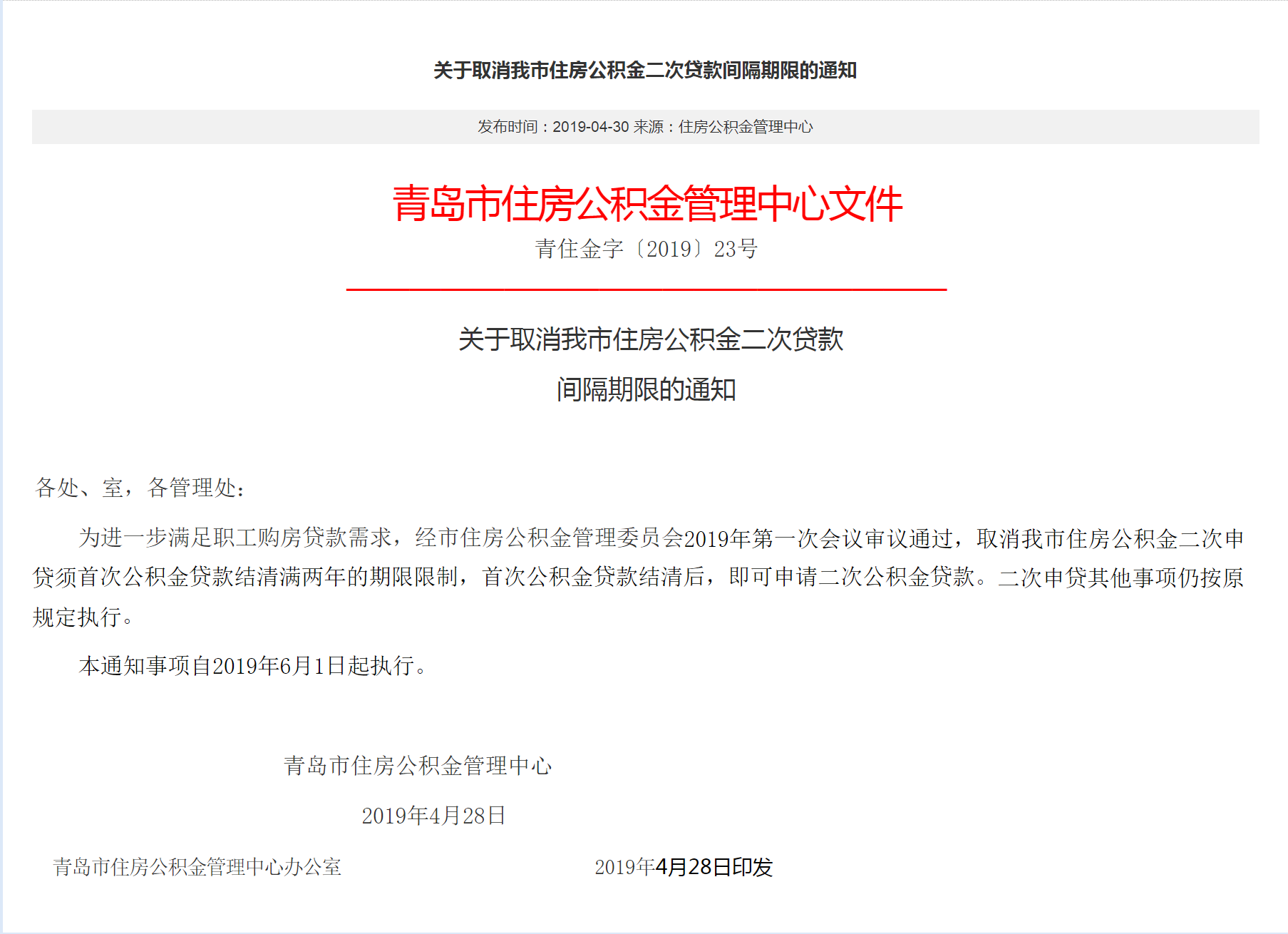 自2019年6月1日起,青岛市住房公积金取消了二次申贷须首次公积金贷款结清满两年的期限限制,职工结清首次公积金贷款后,即可申请二次公积金贷款,二次贷款申贷条件、额度计算等其他事项仍按原规定执行。
