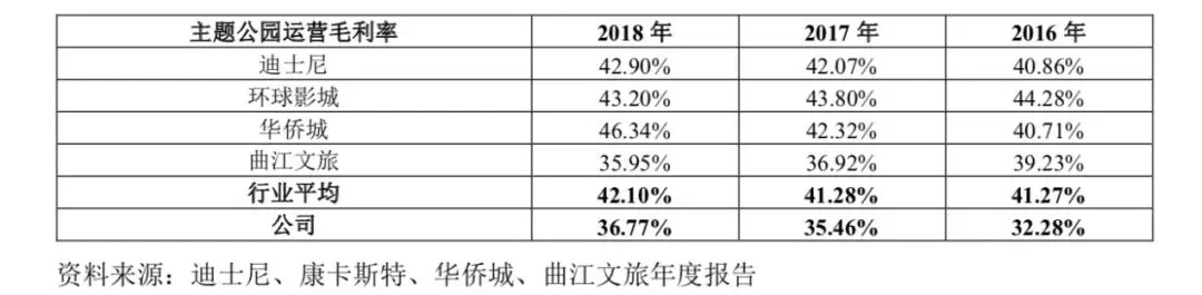 从华强方特招股书中给出的同业数据来看,无论是迪士尼、环球影城这样的世界性主题公园,还是华侨城欢乐谷这样的全国性主题公园,毛利率都超过了40%,华强方特在这个数据上甚至要低于主要布局在西安市场的曲江文旅。