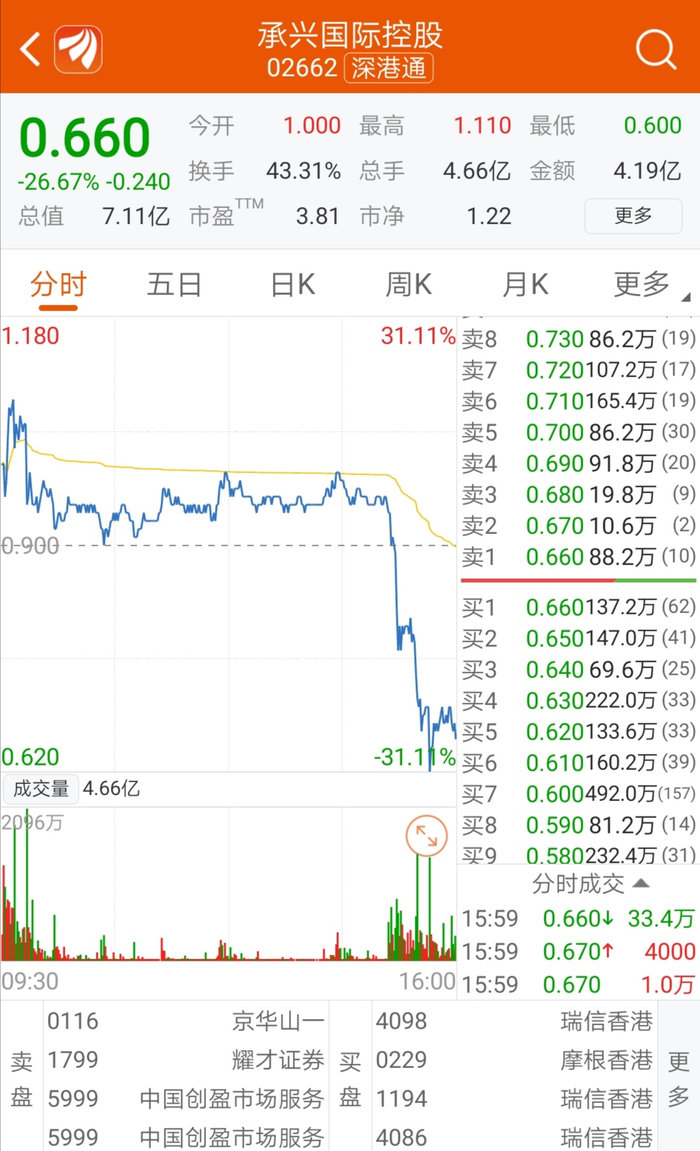 港股承兴国际控股(02662.HK)最惨,7月8日暴跌超90%,7月9日下跌超26%,股价仅剩0.66港元。