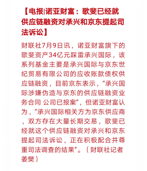 也就是说,债务人京东应当是诺亚与承兴国际约定的应收账款还款人。但有趣的是,今日,据财联社报道,京东方面却称“承兴国际涉嫌伪造和京东的业务合同,目前京东已经报案。”但诺亚财富认为,“承兴国际相关方为京东供应商,双方存在大量长期交易,歌斐已经就这个供应链融资对承兴和京东提起司法诉讼,正在积极配合并尊重司法调查的结果”。