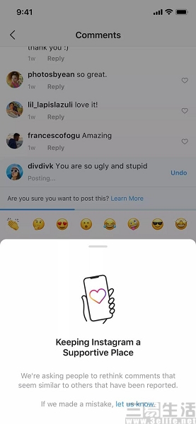 为了便于理解,该报道中举了一个例子,当一位用户在输入“你长得太丑,看起来很愚蠢”并试图发布时,系统便会发出一条通知,询问该用户是否确定要发布这条评论。如果在不知情的情况下,准备开喷的网友诈一下看到这样弹窗提醒,说不定还真的会心虚改口。