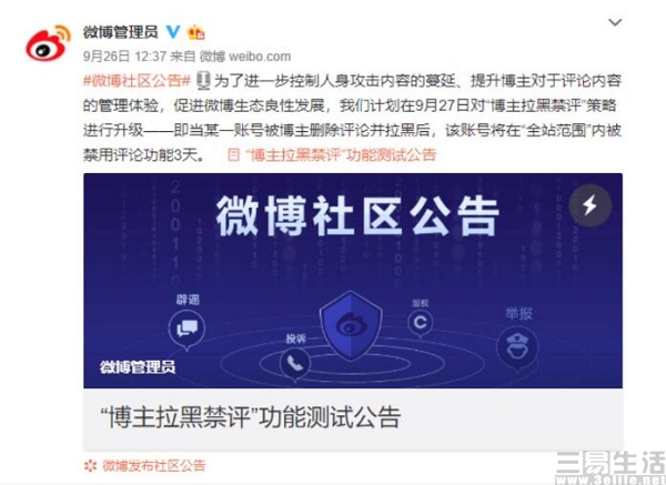 同样是在去年,微博宣布为进一步控制人身攻击内容的蔓延、提升博主对于评论内容的管理体验,促进平台生态良性发展,试行“博主拉黑禁评”策略的升级版。如果某一个账号被博主删除评论并拉黑,那么其将在“全站范围”内被禁用评论功能3天,并且粉丝量在10万以上的博主能够抢先享受测试该功能。