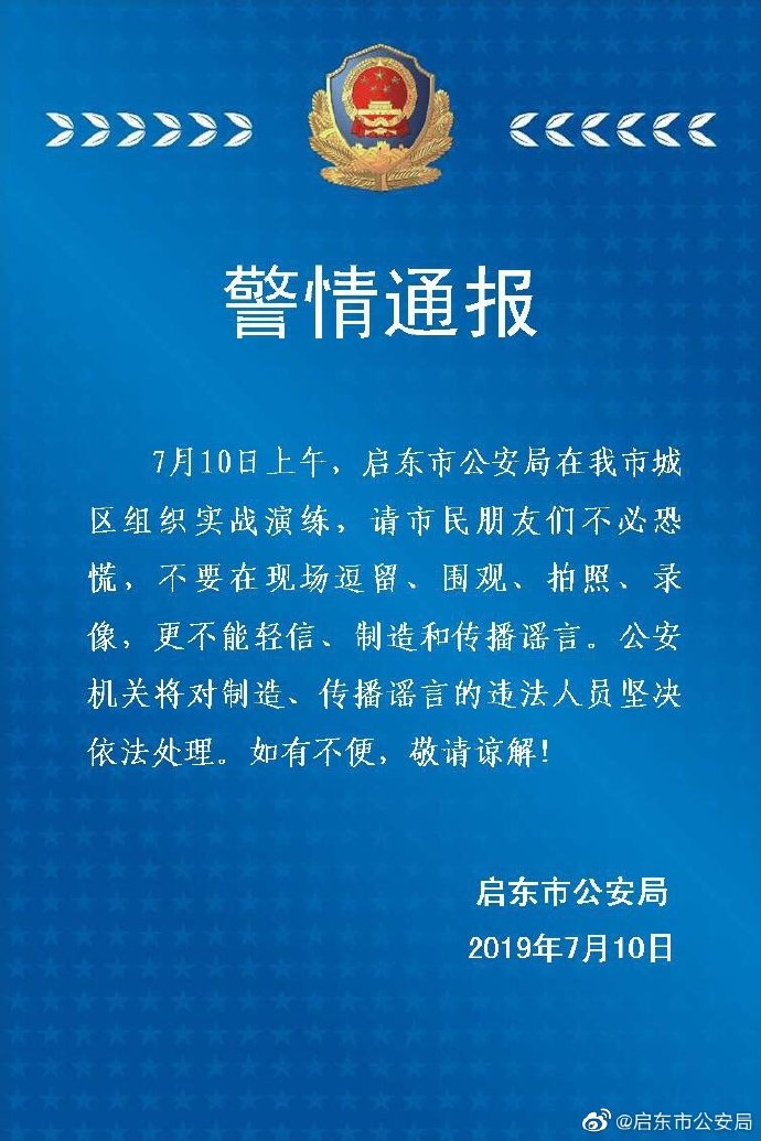 江苏省启东市公安局通报,7月10日上午,启东市公安局在我市城区组织实战演练,请市民朋友们不必恐慌,不要在现场逗留、围观、拍照、录像,更不能轻信、制造和传播谣言。公安机关将对制造、传播谣言的违法人员坚决依法处理。如有不便,警情谅解!