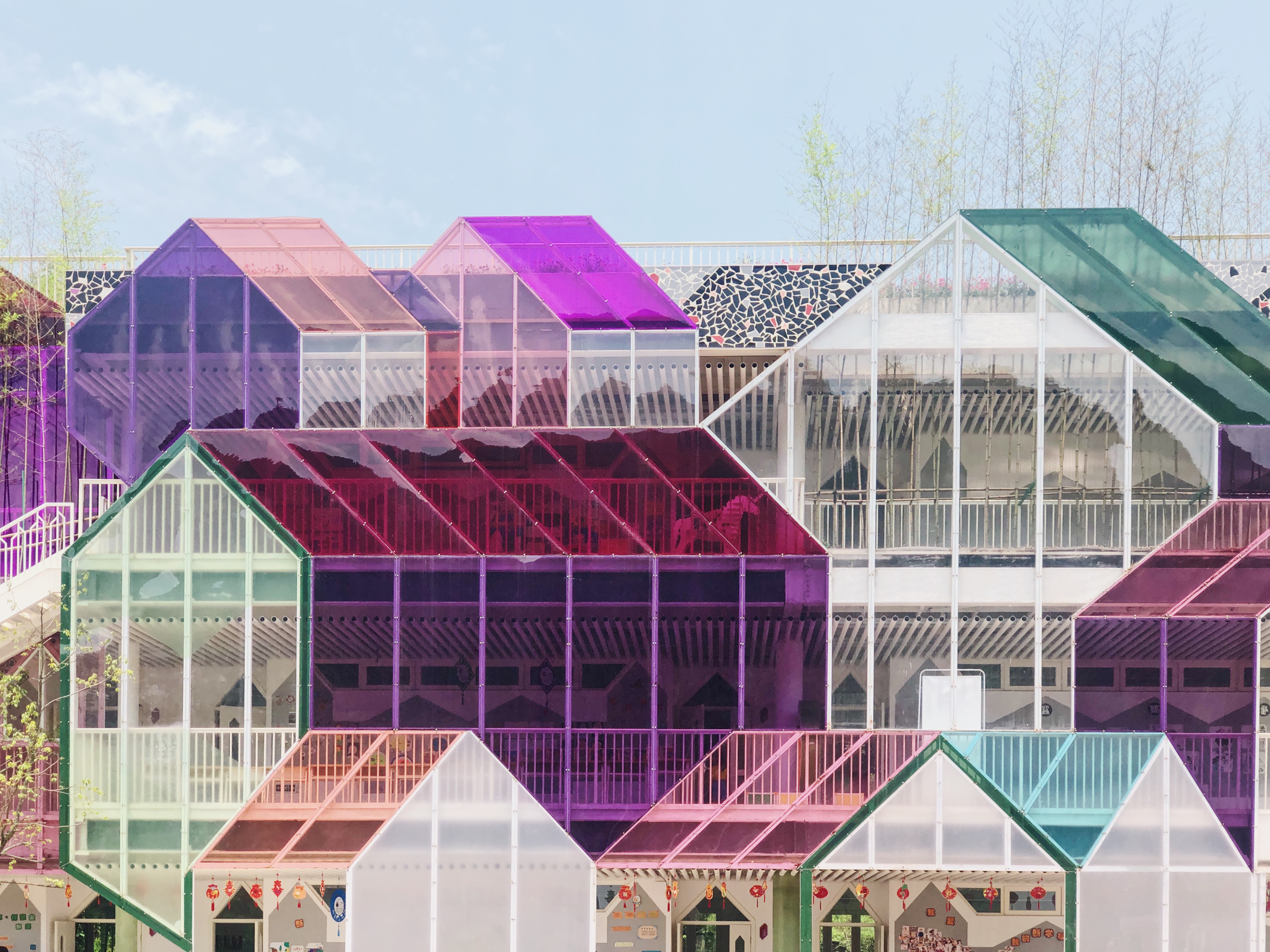 建筑师在原有教学楼走廊的外侧加设了钢结构,加宽了原来狭窄的走廊,在教学楼的西侧搭建了用于课外活动和户外活动的空间,先是有屋顶的风雨操场,接着是一层水池,涂成浅绿色像竹子的细长柱子托起几个位于二层的彩色活动空间,而后是层叠的增设的尖顶小房间,里面放着陶艺、手工的用具,设置了舒适的“小窝”与“树屋”空间,在小屋之间结合儿童玩耍的需要设置攀爬绳网、攀岩斜坡和楼梯配合使用。