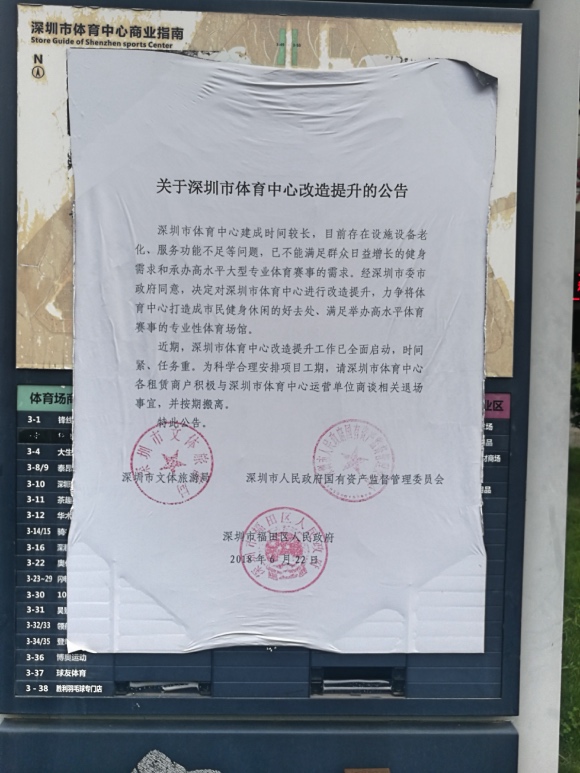 2018年6月22日,深圳市体育中心发布将进行改造提升的公告:深圳市体育中心建成时间较长,存在设施设备老化、服务功能不足等问题,改造力争将体育中心打造成满足举办高水平体育赛事的专业性体育场馆。