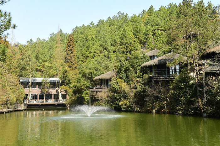 裸心谷占据了两座小山,经过马场,绕过茶山,进入山谷,山谷的两边是依山而建的夯土小屋和树顶别墅。居住在这里就仿佛置身于世外桃源。