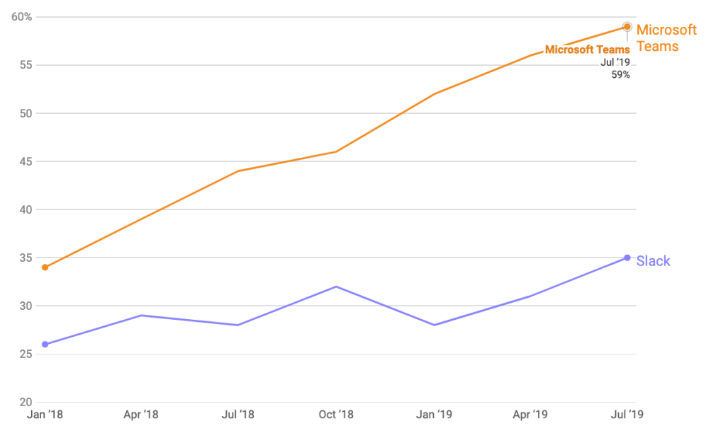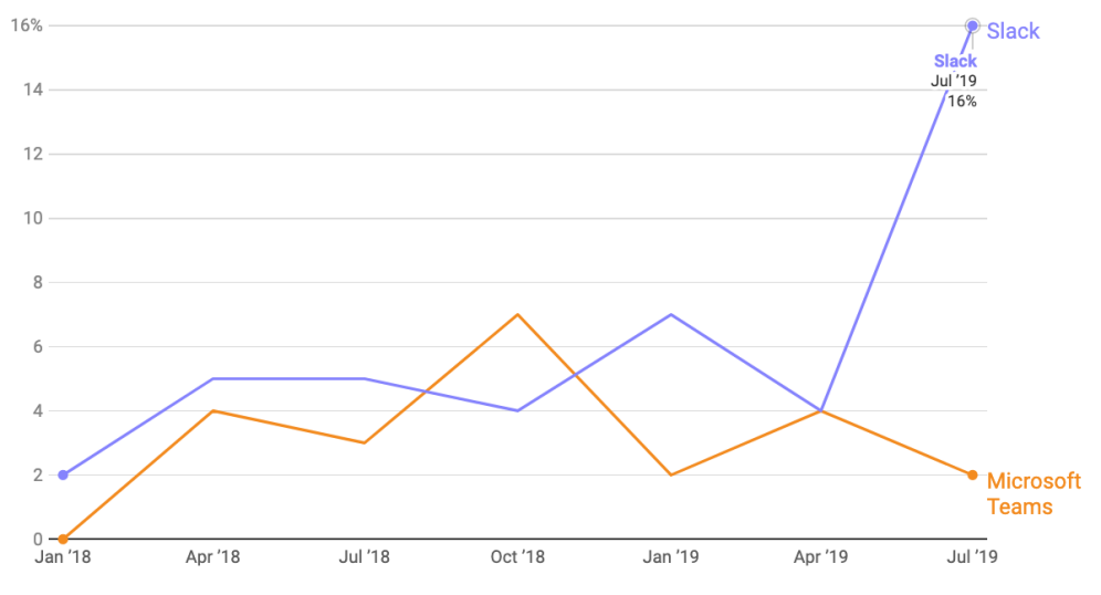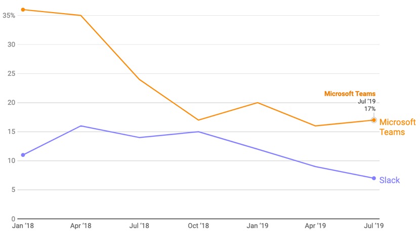 与此同时,调查数据显示,微软Microsoft Teams的市场份额正在增加,采用率相对较高,弃用率比Slack略低。
