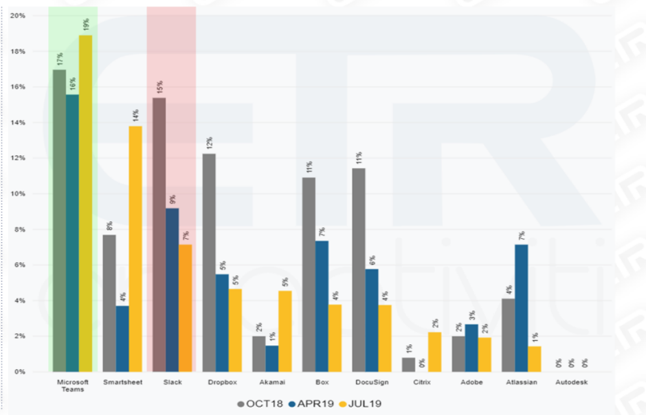 本周,一份来自知名市场调研公司ETR的最新调查结果,对Slack而言才是最为沮丧的消息。这份市场调研报告来自于对900名CIO及公司IT决策管理人员的访谈,主要内容涉及企业的IT预算走向,这些访谈对象的公司大概占到全球500强企业的40%。