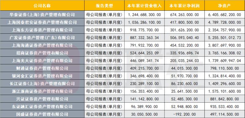 营收排名前五的券商资管为华泰资管、国泰君安资管、东方资管、广发资管和海通资管,净利前五为华泰资管、广发资管、海通资管、国泰君安资管和招商资管。