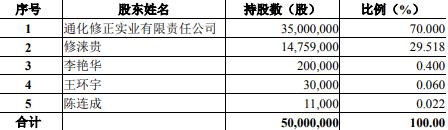 据天眼查,修涞贵、李艳华分别持有通化修正实业有限责任公司98%和2%的股份,故修涞贵、李艳华实际合计控制修正药业99.918%的股权。