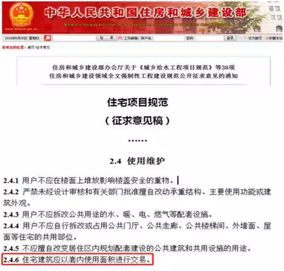 2019年2月15日,住房和城乡建设部办公厅发布38项住房和城乡建设领域全文强制性工程建设规范征求意见稿,其中《住宅项目规范(征求意见稿)》中的一条规定“2.4.6住宅建筑应以套内使用面积进行交易”引发热议,消费者一边倒地叫好,要知道,我们每天都在为这个不知道怎么算出来的公摊面积交着取暖费、物业费。