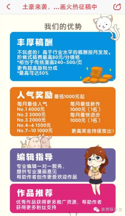 比起有妖气一年200万的稿酬支付,可米酷算是远远高出了同行的标准。同时,推出了大奖赛、人气PK月赛等一系列鼓励创作的激励措施,近期还以大手笔的投入,启动了周赛投稿激励机制,来持续推动原创条漫的发展,让更多优秀的漫画人才可以有一个体面的物质保障基础,全心投入创作。“因为创意这个东西,你总不能让别人饿着肚子,就让一帮人天天业余过来搞创意这个事情。”站在历史的角度,肩负行业的责任感,可米酷的CEO黄胜辉坚信,只有拥有好的平台,好的环境,才能对画师有更高的要求。
