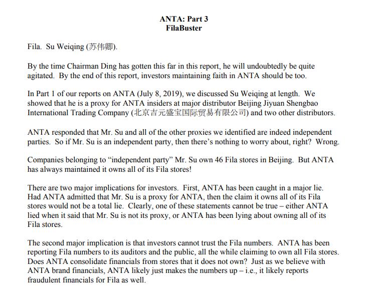 浑水质疑称,安踏很可能在斐乐品牌方面也报告了欺诈性的财务状况。