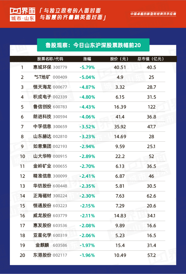 青岛市跌幅榜首:惠城环保(300779),涨幅-5.79%,股价40.51元,总市值40.5亿元。