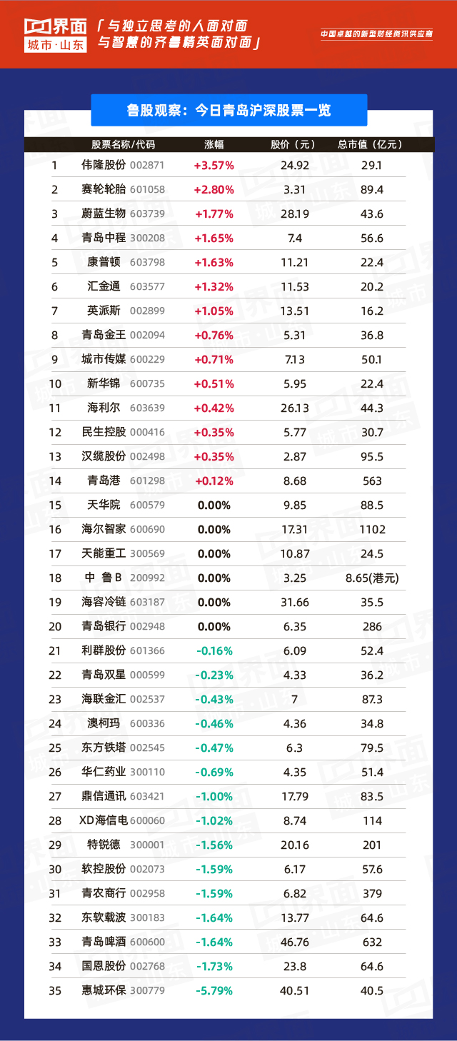 青岛市涨幅榜首:伟隆股份(002871),涨幅3.57%,股价24.92元,总市值29.1亿元;