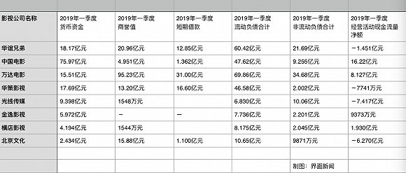 界面新闻记者整理了部分上市影视公司资产负债情况,可以看出,截至今年一季度,华谊兄弟在流动负债,非流动负债,经营活动产生的现金流量净额等多方面,表现均不佳。