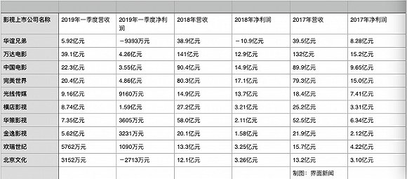 界面新闻记者整理了近年来部分影视类上市公司营收净利润表现情况,可以看出,目前的华谊兄弟,早已不复往日风采。2018年,华谊兄弟巨亏超10亿元。2019年一季度,华谊兄弟净利润为-9393万元,业绩表现几乎垫底。