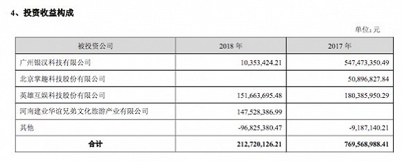 自2010年开始,华谊兄弟开始布局游戏领域的投资,并先后参股掌趣科技,银汉游戏,英雄互娱等项目。从2018年年报可以看到,上述几个游戏类公司投资收益成绩良好,并且通过多次股权出售,支撑了华谊兄弟已不太亮眼的财务数据。2016年,华谊兄弟出售掌趣科技股份获得超10亿元收益,当年公司净利润为8.08亿元。2017年,华谊兄弟6.47亿元出售银汉科技25.88%的股份,收益超过当年净利润的六成。