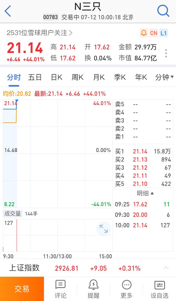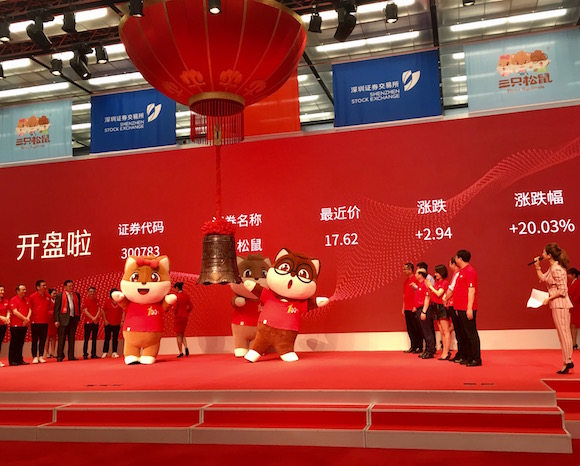 7月12日,三只松鼠在深交所创业板挂牌上市,股票代码300783,发行价14.68元。三只松鼠股价开盘17.62元,上涨20.03%,截至发稿,三只松鼠已经涨停至21.14元,市值达到84.77亿元。