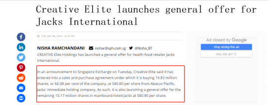 据The Business Times报道,按照当时的购买协议,Creative Elite公司以0.80新元/股的价格从Jacks International购买3000万股股票,占总股本83.36%,也就是说,罗静买下这家壳只花了大约1.2亿元人民币。