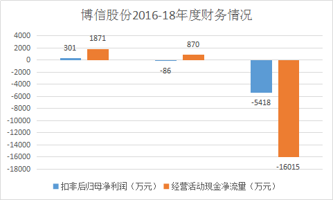 “财技过人”的罗静在新加坡股市、港股玩的风生水起,却在A股栽了跟头。财务数据显示,在罗静接手后,博信股份原本羸弱的财务状况愈发严峻:2017年-2018年,公司扣非后归属母公司股东净利润分别为-86万元、-5418万元,同比分别下跌128.63%、6191.22%。2018年经营活动现金净流量更是遭遇断崖式暴跌,为-1.6亿元,为公司上市以来最低。