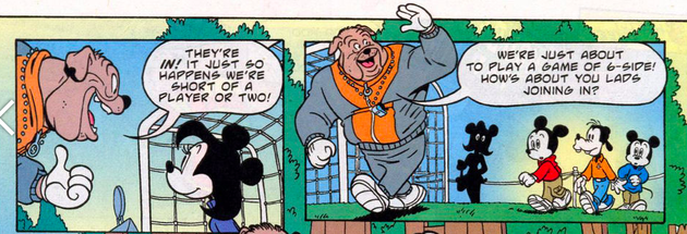 Rodriguez回忆说Bergstrom、Halas和他(记者无法与前两位取得联系)当时在丹麦哥本哈根,仅花了一周时间便描绘出了这一系列的故事情节。这套版本的米老鼠故事围绕一支名为“Riverside Rovers”的足球队展开,米奇的两位外甥以及高飞的外甥Gilbert都有在本系列中出场。