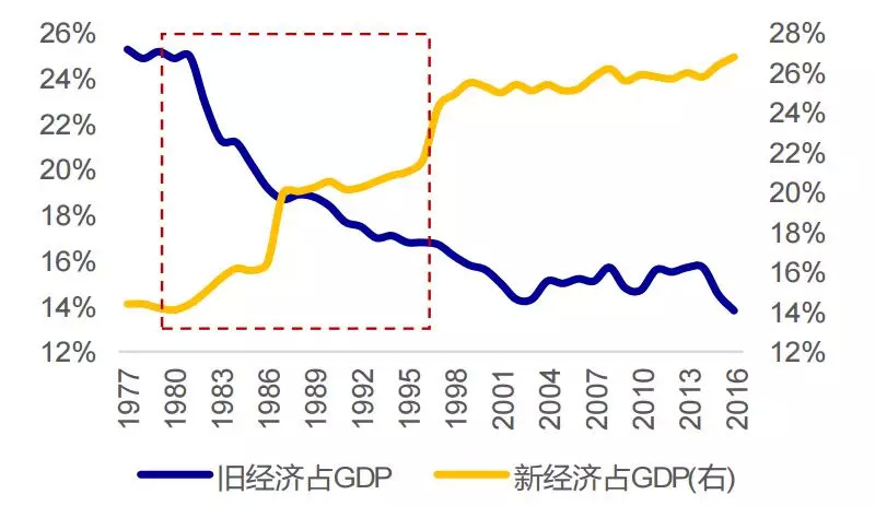 数据显示,美国包括股权、定增、发债在内的直接融资占比从1980年的不足10%上升至1993年的73%,同期信贷融资占比从97%下降至27%。产业结构逐渐向先进制造和高端消费转移,1980年至1999年信息技术、金融、可选消费与工业行业中的企业IPO数量位列所有行业前四,分别为278、187、181与138家;新经济占GDP比重由1980年的14%左右提升到了1995年的20%左右。