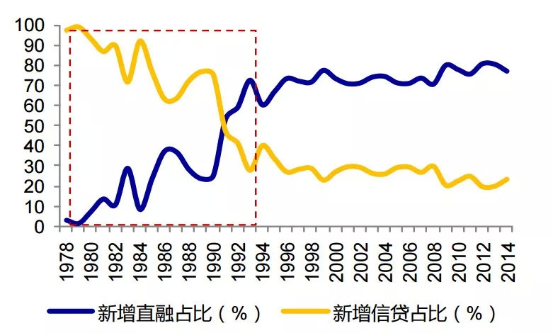 表1.美国上世纪80年代至今直融与信贷占比;数据来源:Bloomberg、申万宏源
