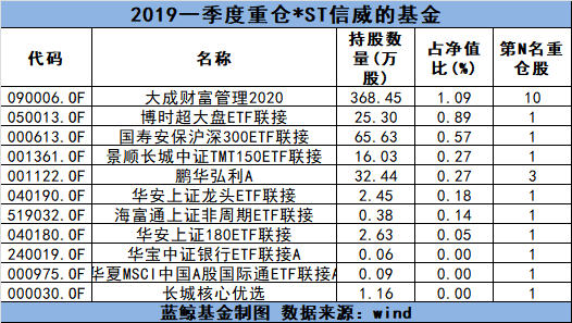 据wind数据统计,截至2019年一季度末,仍然有11只基金的前十大重仓股名单出现了“*ST信威”,其中分别有3只主动型混合基金和8只被动指数基金。