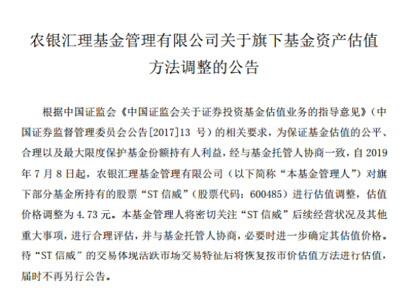 基于对*ST信威的悲观预期,自2018年3月以来,就陆续有创金合信、景顺长城、博时基金、天弘基金、南方基金等多家公募陆续下调停牌股票“信威集团”估值,价格多在8.11~10.64区间,较之停牌前的14.59元相当于5~11个跌停板(跌停一次为5%)。