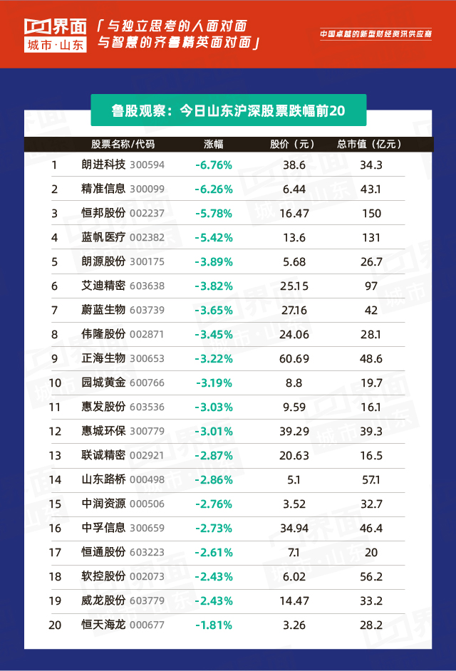 济南市跌幅榜首:朗进科技(300594),涨幅-6.76%,股价38.6元,总市值34.3亿元。