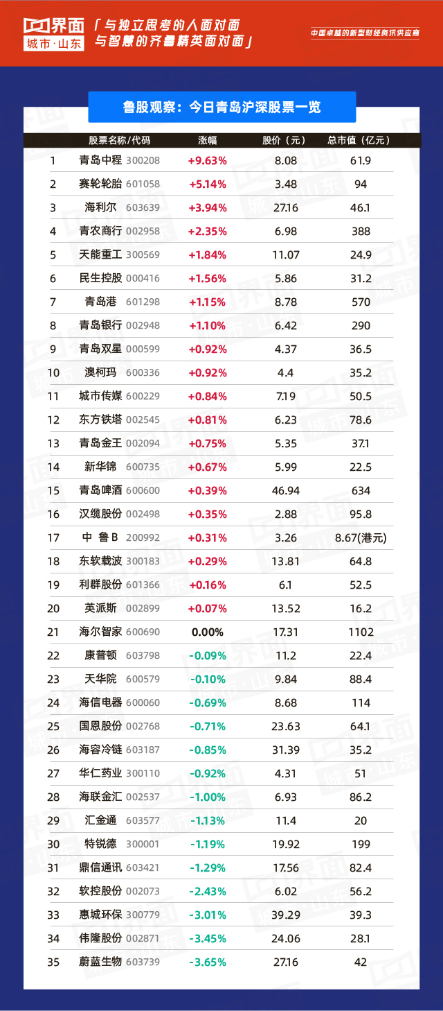 青岛市涨幅榜首:青岛中程(300208),涨幅9.63%,股价8.08元,总市值61.9亿元;