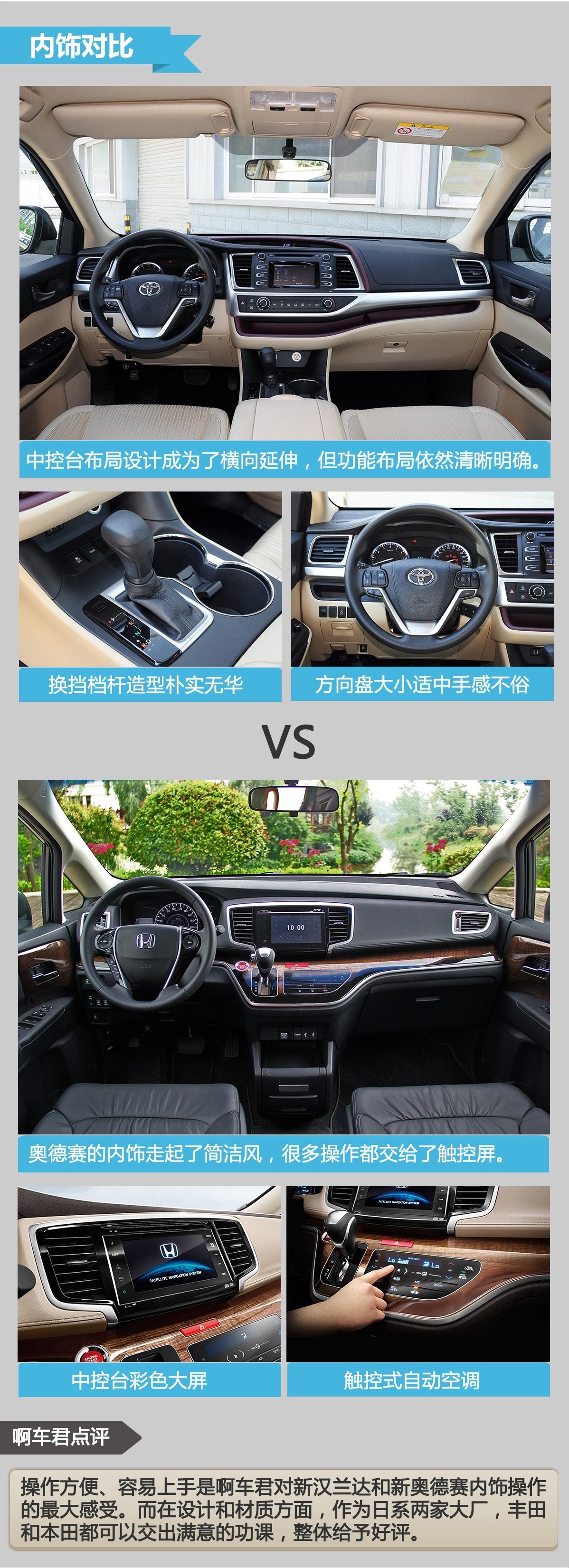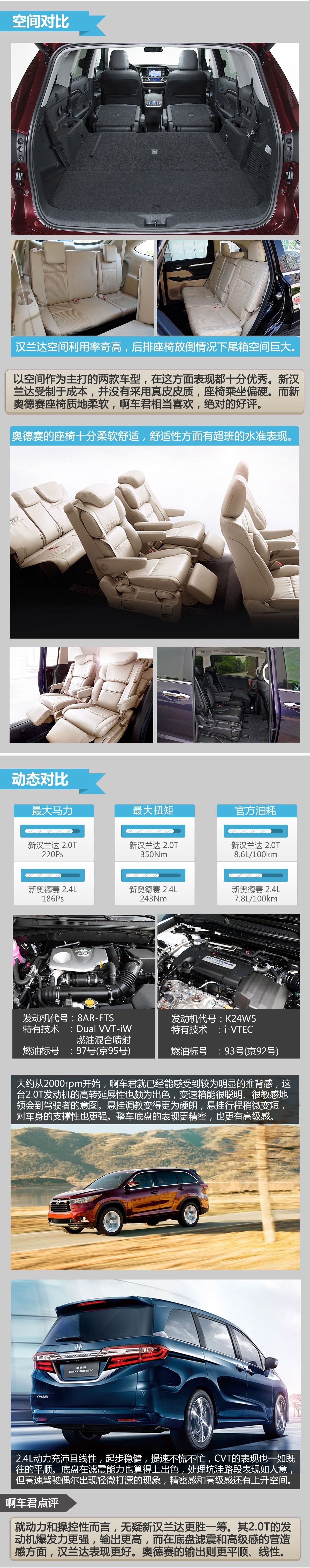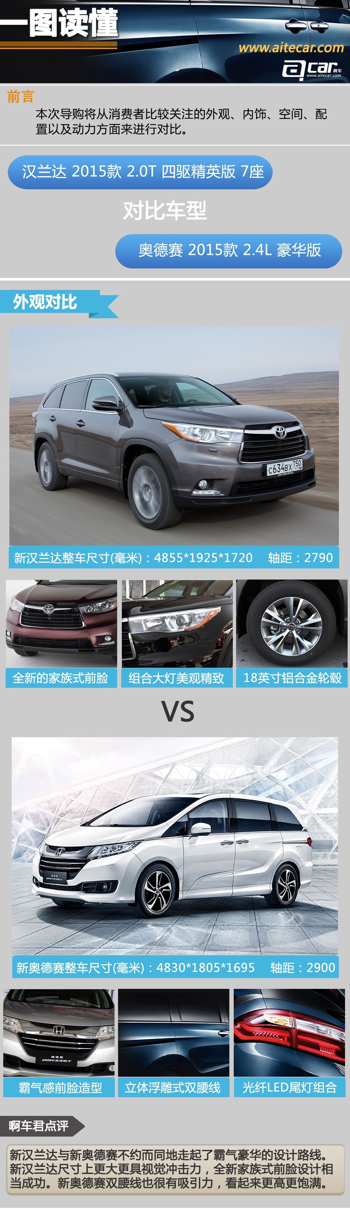 本次对比导购中,啊车君挑选了价格区间相近都是25万级别的车型,分别为厂商指导价为25.88万的汉兰达 2015款 2.0T 四驱精英版 7座和厂商指导价为24.98万的奥德赛 2015款 2.4L 豪华版。
