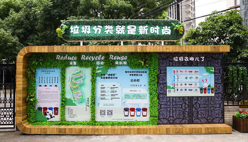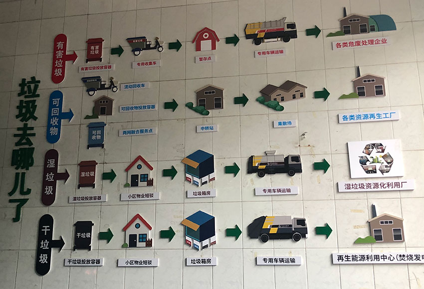 针对宇泰景苑占地面积小、人口密度高,难以添置大型垃圾分类减量装置的现状,小区将原来的垃圾房建成了一座小压站,用于干垃圾压缩。墙上还贴有垃圾四分类后的处理过程,为前来扔垃圾的居民科普垃圾分类的必要性。