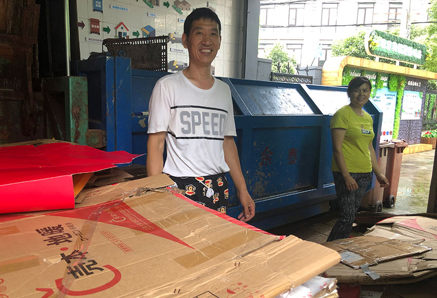 马大龙、田校玲夫妇正在把压缩过的纸箱搬运到三轮车上。马大龙介绍,他是小压站的负责人,负责站点的清洁、垃圾二次分类等工作,妻子田校玲也是小区里的保洁员,负责清洁楼道。二人都是宇泰景苑小区里的住户,安徽人,做保洁工作已经五年有余。“环卫干垃圾清运车两周来一次,像纸箱这样的可回收垃圾,我们会收集起来卖到有营业执照的废品回收站,卖得的收入还能补贴家用。”