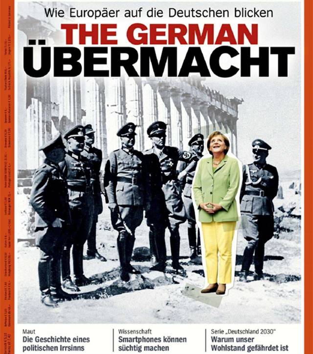 德国《明镜》周刊曾自嘲般地刊登了一张拼版照片:默克尔身后是一群刚刚占领希腊的纳粹军官,在希腊标志性建筑前合影。