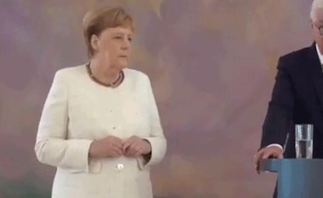 默克尔的健康,肯定遭遇了某种问题。但即便如此,她仍必须坐着出席欢迎仪式,也可见她背负的巨大压力。