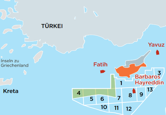 与Fatih号配合行动的,还有土耳其方面于7月8日派出的另一艘钻探船Yavuz号,以及一艘地质考察船Barbaros Hayreddin号。三艘土耳其船只分头从东、西、南三个方向闯入塞浦路斯海域进行非法勘探,目的只有一个:在东地中海底的油气资源上分一杯羹。