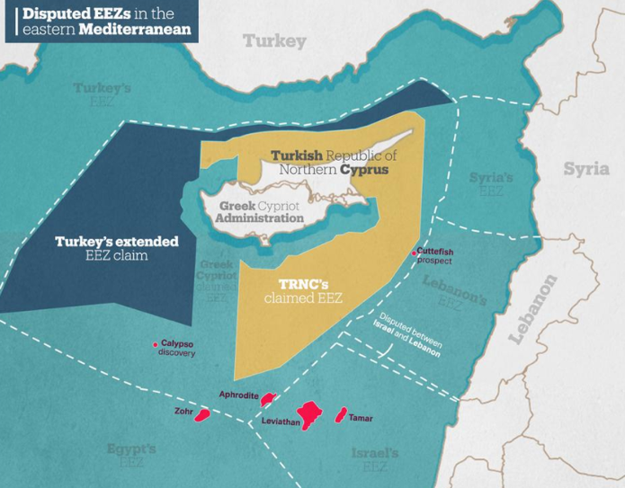 常年以来,塞浦路斯以希腊族和土耳其族聚居区为界,分裂为南北两部分。其中,北塞浦路斯土耳其共和国未得到国际承认,却得到了土耳其的大力支持。在国际法层面,土耳其并不承认塞浦路斯共和国,该国的专属经济区主张自然也被土耳其无视了。