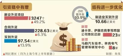 不久前,上海引进外资工作交出“半年答卷”:新设外资项目3247个,同比增长49.2%;合同外资228.63亿美元,同比增长6.3%;实到外资97.54亿美元,同比增长13.9%……
