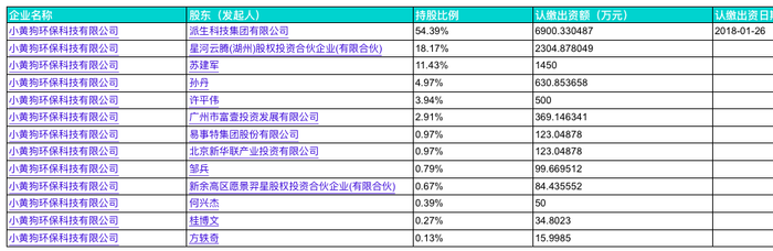 企查查信息显示,小黄狗环保成立于2017年8月,注册资本约1.27亿,除派生科技集团有限公司持有54.39%外,其余12名股东包括,中植系背景的星河云腾(湖州)股权投资合伙企业(有限合伙)(下称“星河云腾”)、新华联集团旗下北京新华联产业投资有限公司(下称 “新华联产业”)、A股上市公司易事特(300376)、合景泰富地产集团创办人孔健岷旗下广州市富壹投资发展有限公司等。