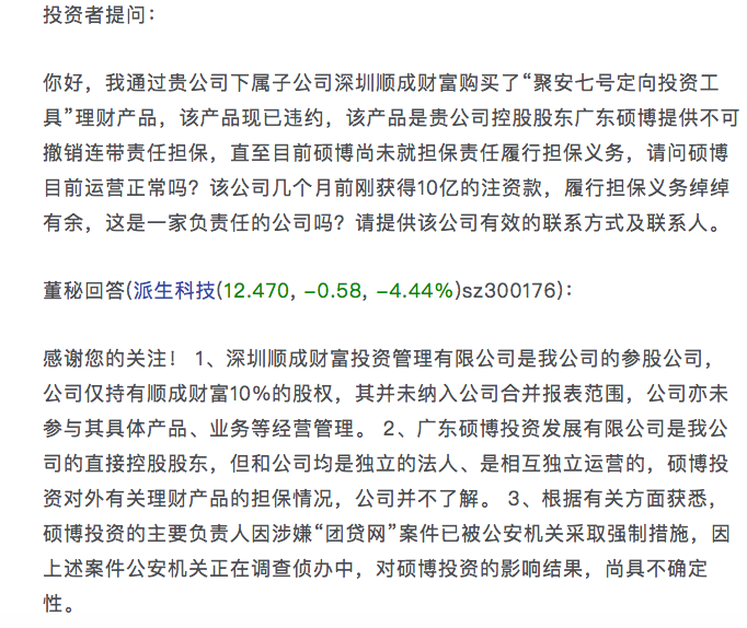 新浪问董秘栏目显示,5月14日,有投资者称,通过深圳顺成财富购买了“聚安七号定向投资工具”理财产品违约。此次的业绩预告显示,顺成财富已处于人员解散、业务中止的状况。
